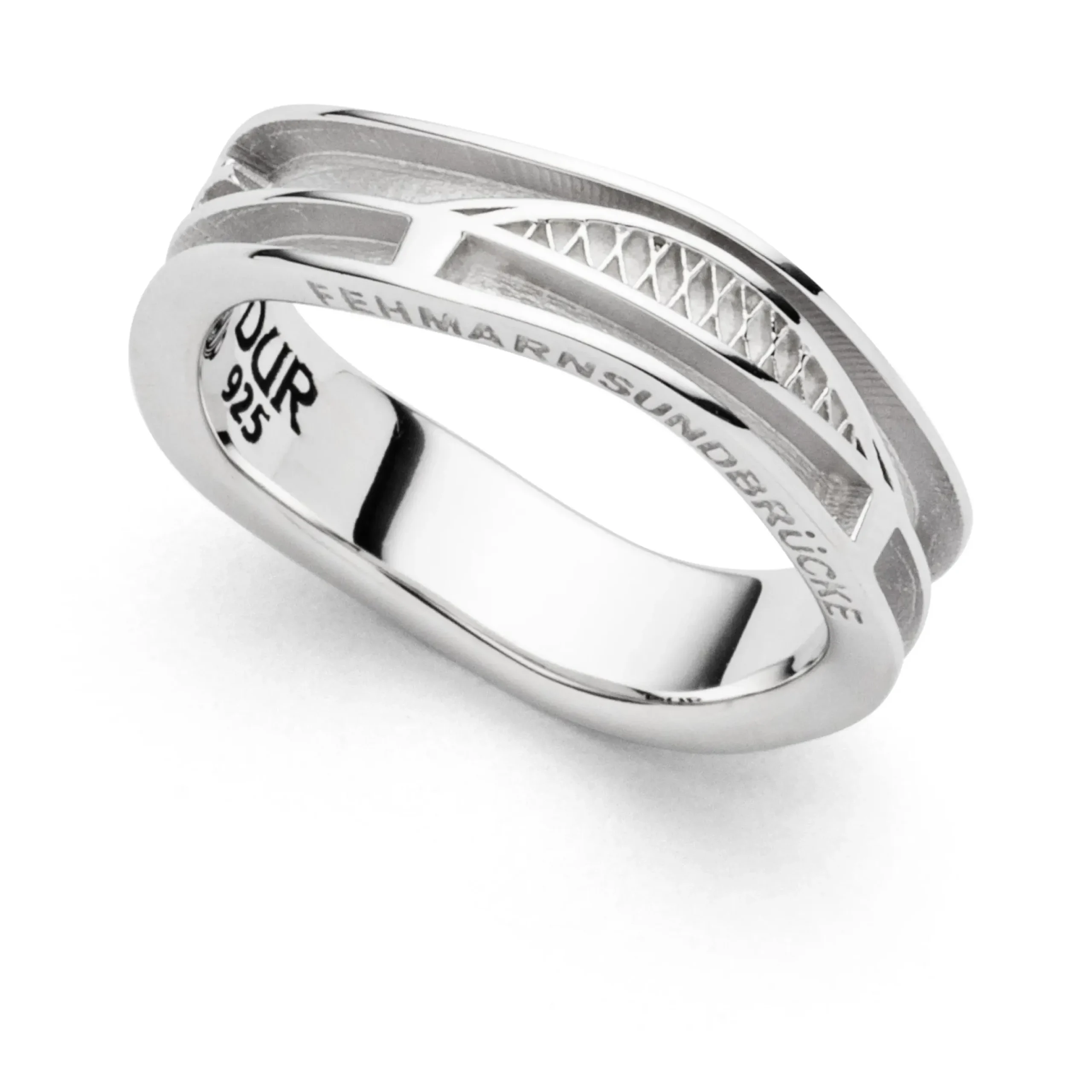 Ring Strandwellen „Fehmarnsundbrücke“ in Bandform ohne Sand, mit den 3 Motiven: – Möwe – Fehmarnsundbrücke – Möwe, beide Wellen mattiert und rhodiniert und dem eingravierten Wort „Fehmarnsundbrücke“ im Rand, alles aus rhodiniertem 925er Sterling-Silber. Durch die Rhodinierung ist das Schmuckstück anlaufgeschützt.