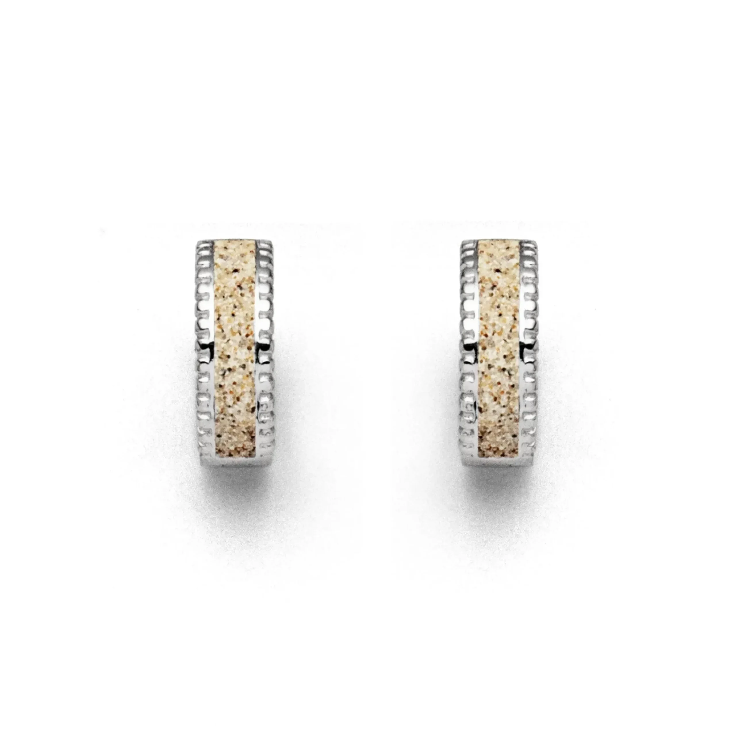 Klappcreole „Strandzauber“ mit kleinen Silberkügelchen am Rand und gefüllt mit Strandsand, gefasst in rhodiniertem 925er Sterling-Silber. Durch die Rhodinierung ist das Schmuckstück anlaufgeschützt.