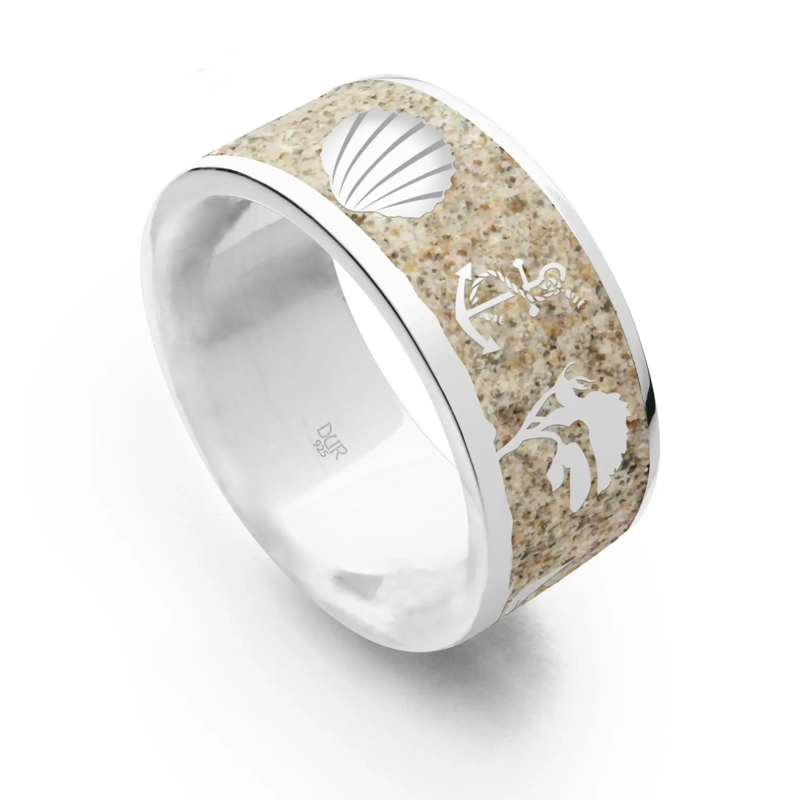 Sommer, Sonne, Strand und Meer – Die Ostsee fasziniert mit endlosen Sandstränden, idyllischen Seebädern und einzigartigen Naturschauspielen. Als Erinnerung an schöne Urlaubsmomente, einen besonderen Lebensabschnitt, oder für alle, die ihre Liebe zur Ostsee stilvoll zum Ausdruck bringen möchten, ist dieser elegante und zeitlose Strandring ein unverzichtbarer Begleiter.Der glanzvolle Bandring verspricht höchsten Tragekomfort durch hochwertige Materialien und überzeugt durch sein klares Design, sowie eine hohe Symbolik, die ihn für jeden Tragenden einzigartig macht.Auf dem außergewöhnlichen Band des natürlichen Strandsands sind formschön verschiedene Motive (Möwe, Leuchtturm, Strandkorb, Muschel, Anker, Windflüchter, Segelboot) eingearbeitet, welche die Vielfältigkeit der Ostsee auf zauberhafte Weise einfangen.Der geschmackvolle Kontrast zwischen poliertem, rhodiniertem Silber sowie den feinen Sandkörnern zieht alle Blicke auf sich und erinnert an traumhafte Urlaube am Meer.Funkeln Sie mit diesem entzückenden Schmuckstück um die Wette und tragen Sie immer einen Teil der Ostsee ganz nah bei sich