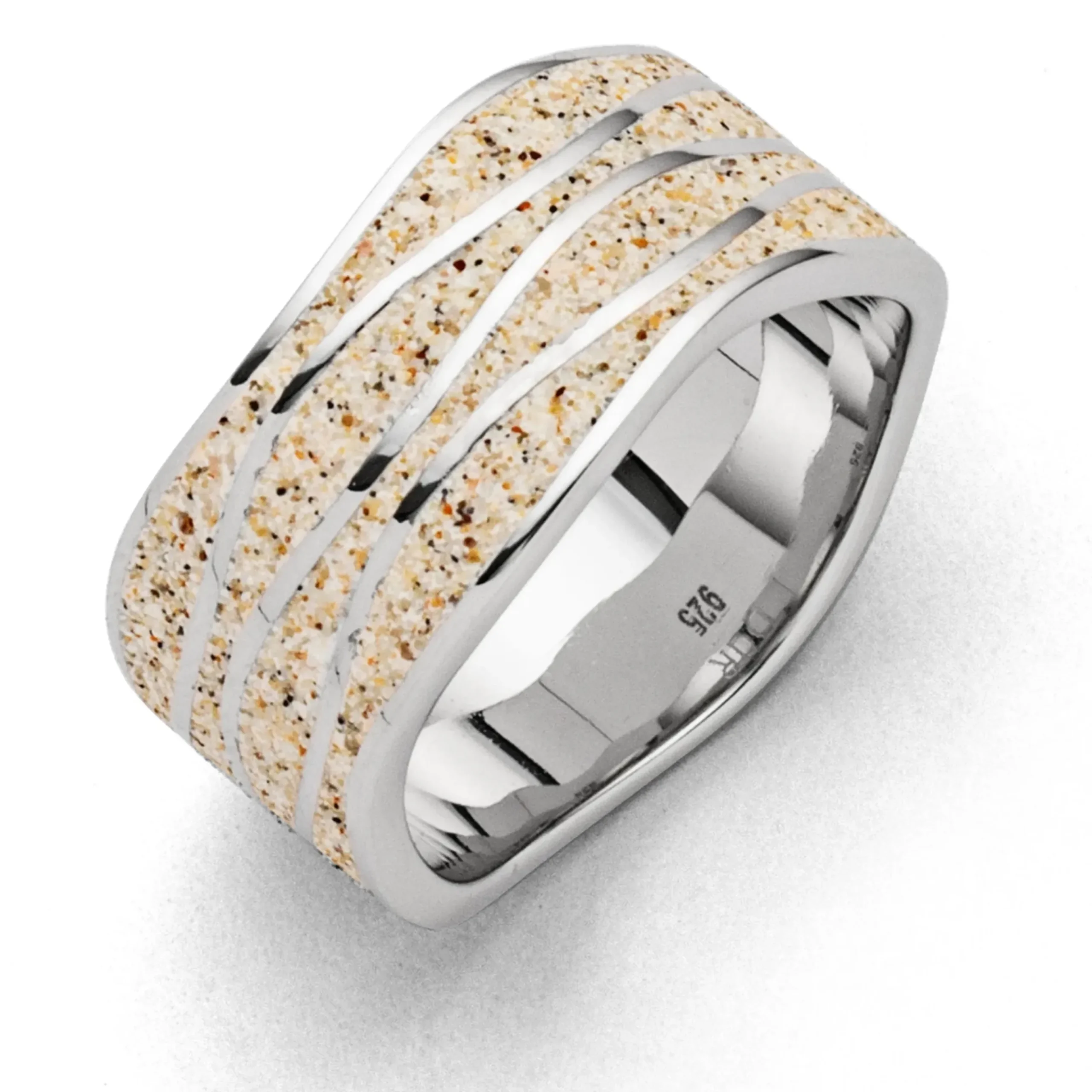 Ring „Strandwellen“ in Bandform, ausgefüllt mit Strandsand aus rhodiniertem 925er Sterling-Silber. Durch die Rhodinierung ist das Schmuckstück anlaufgeschützt.