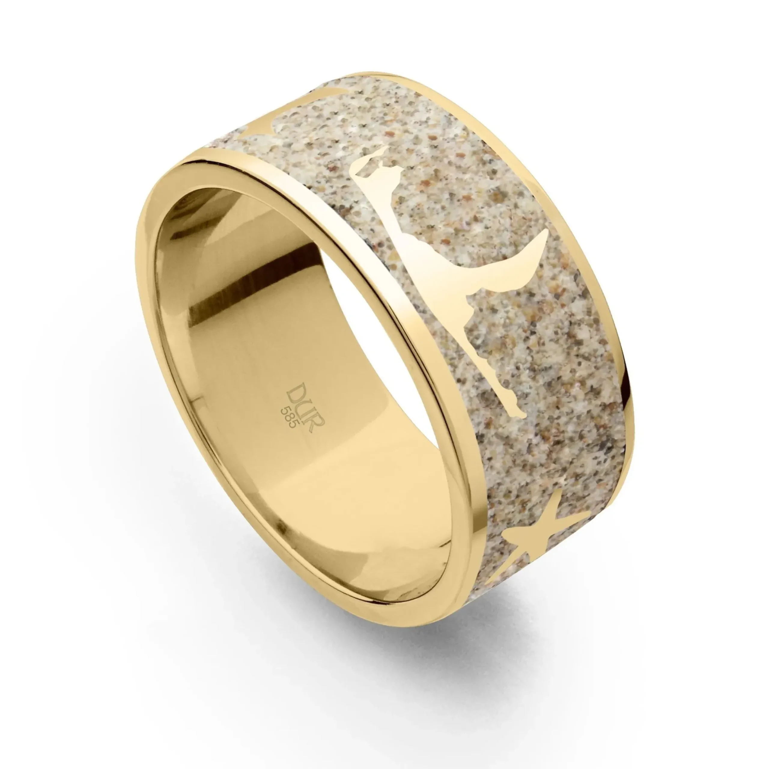 Strandsandring „Sylt“ Premiumausführung mit dem silberplattiertem Inselmotiv auf Strandsand gefasst in 925er Sterling-Silber vergoldet.